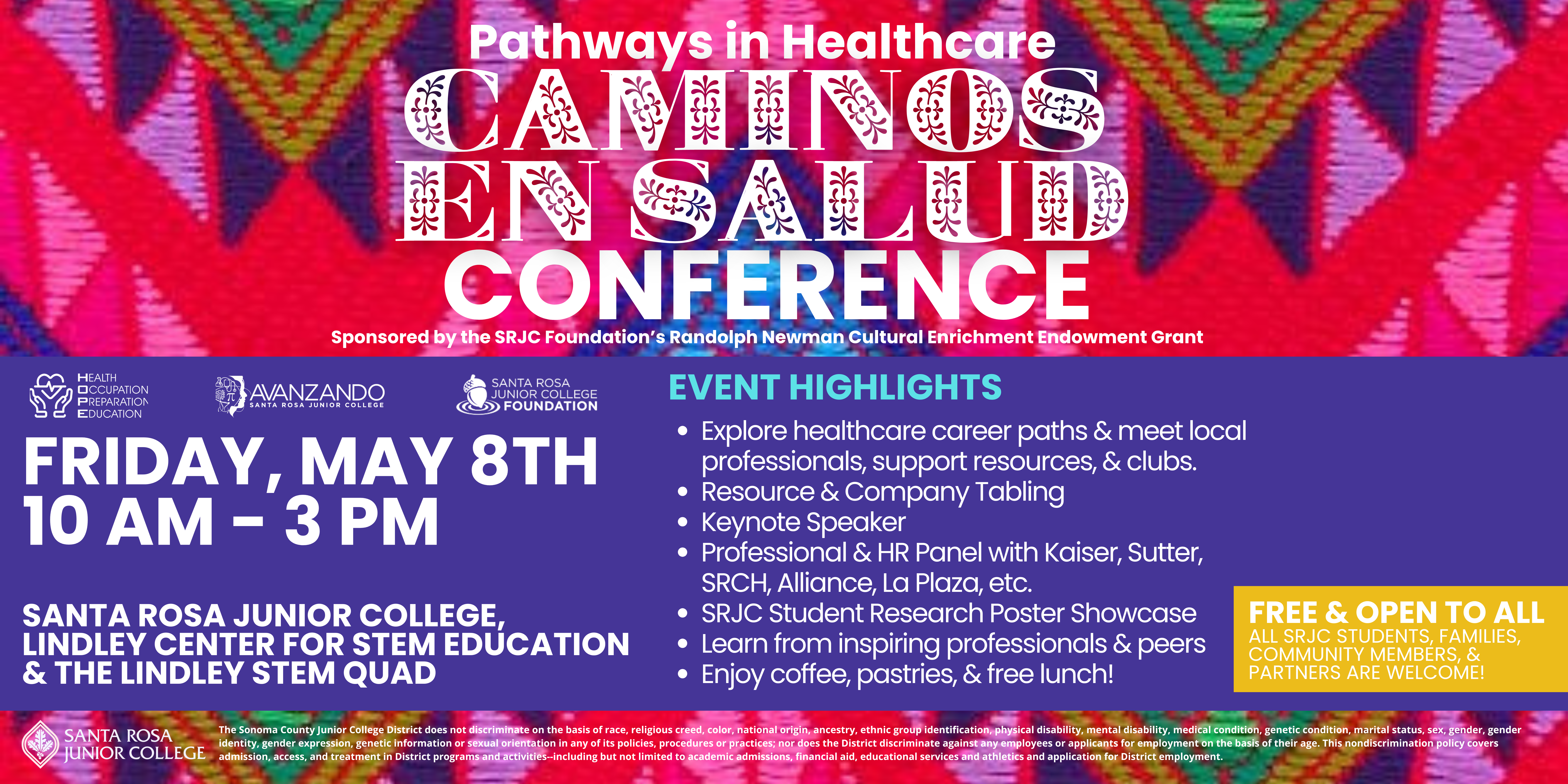 Caminos en Salud (Pathways in Healthcare) Conference, hosted by the Santa Rosa Junior College (SRJC) HOPE and HSI-STEM Avanzando programs and supported by the Randolph Newman Cultural Enrichment Endowment (RNCEE) Grant, is a one-day event designed to connect students with healthcare professionals, educators, and community leaders.